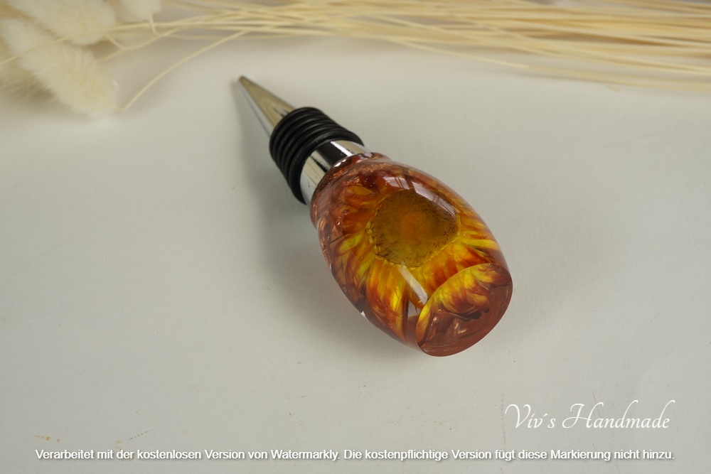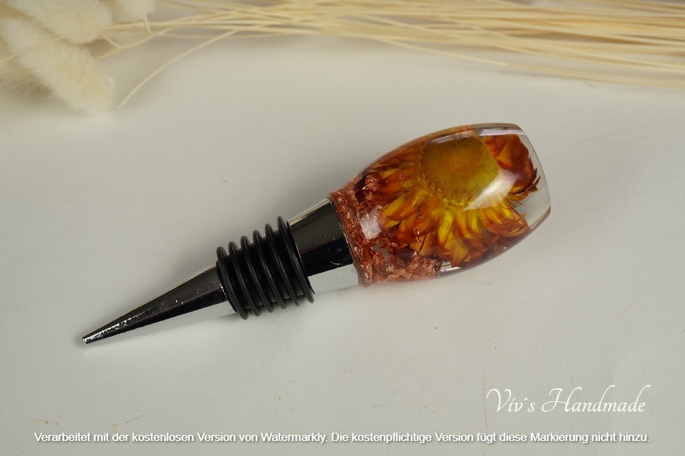 Dieser längliche Weinverschluss* ist ein Meisterstück der Handwerkskunst. Der Kopf aus klarem Epoxidharz ist kunstvoll mit einer echten, getrockneten Blume und schimmernden Glitzerflocken gefüllt – eine wunderschöne, romantische Kombination, die in der eleganten Form perfekt zur Geltung kommt.