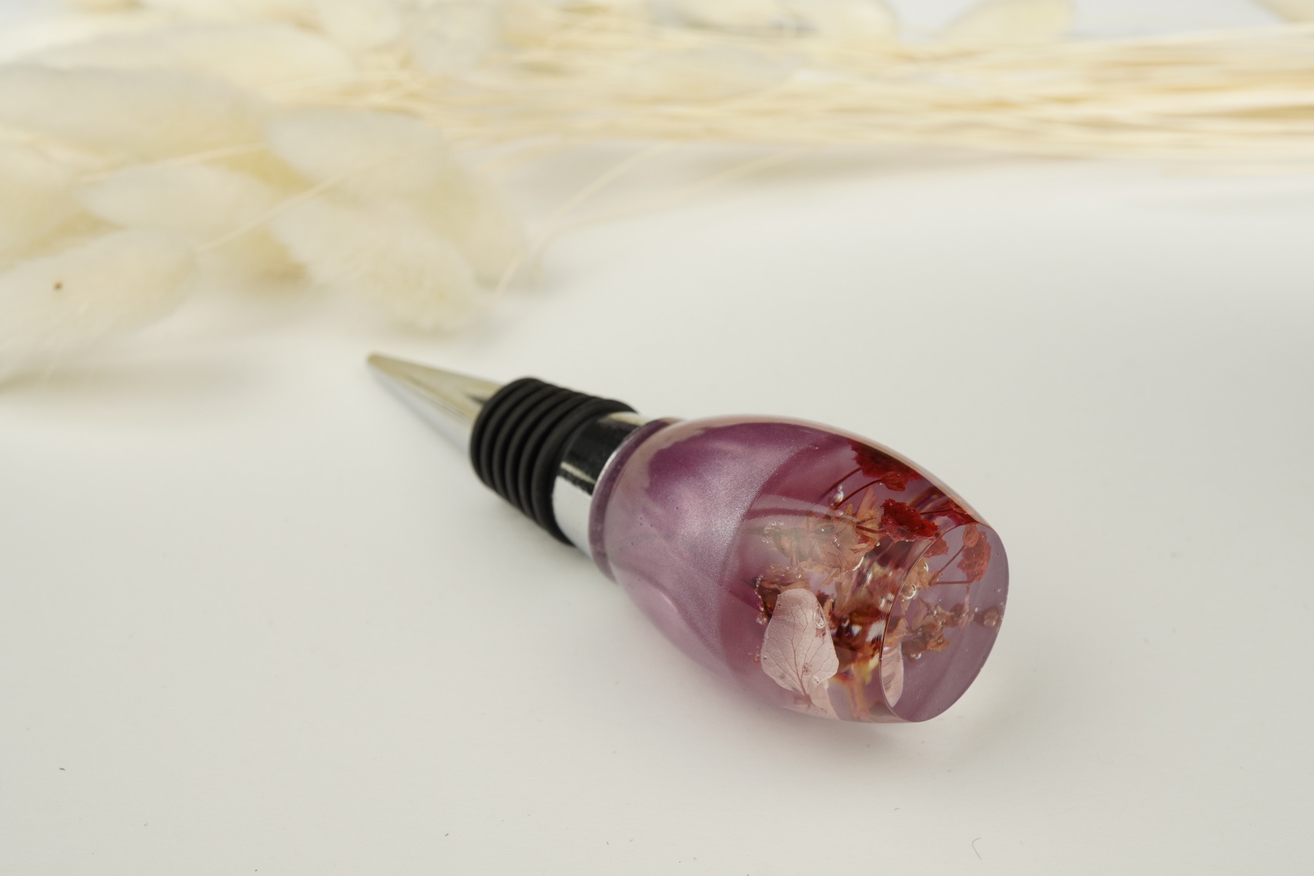 Dieser längliche Weinverschluss* ist ein Meisterstück der Handwerkskunst. Der Kopf aus klarem Epoxidharz ist kunstvoll mit einer echten, getrockneten Blume und schimmernden Glitzerflocken gefüllt – eine wunderschöne, romantische Kombination, die in der eleganten Form perfekt zur Geltung kommt.